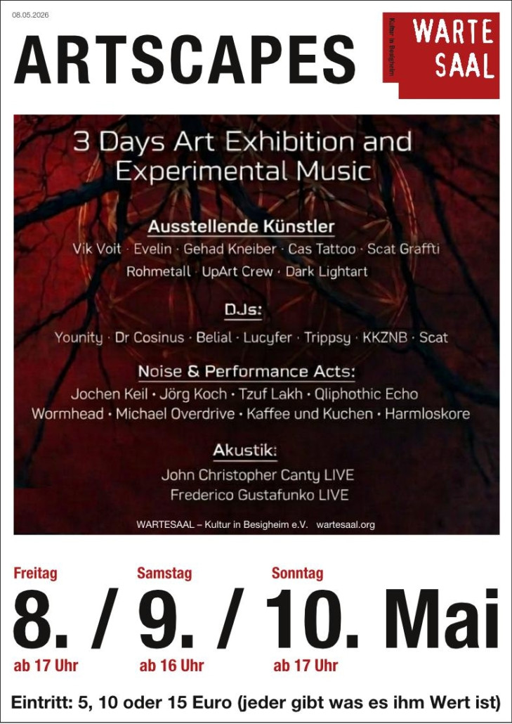 Eine dreitägige Ausstellung zeitgenössischer Kunst, in der visuelle Arbeiten und experimentelle Live-Musik aufeinander treffen. Zwischen treibenden DJ-Sets, extremen Live Acts und Performance-Künstlern sowie Grafitti und Tattoos entsteht ein Raum, der nicht nur betrachtet, sondern erlebt wird. Ein Ort für alle, die Kunst nicht nur sehen, sondern ihre Grenzen kennenlernen wollen. Mehrere Räume jeweils von einem Künstler gestaltet, wie immer begleitet von experimenteller Musik mit je einem Thema an einem der Tage des Wochenendes. Wir freuen uns schon darauf, diese Tage der Kunst und Diversität mit euch zu erleben.